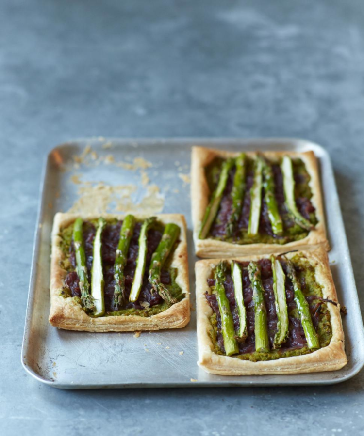 Leaving a 1cm border around the edge of each pastry rectangle, spread a quarter of the pea purée over each, followed by a quarter of the caramelised onions.