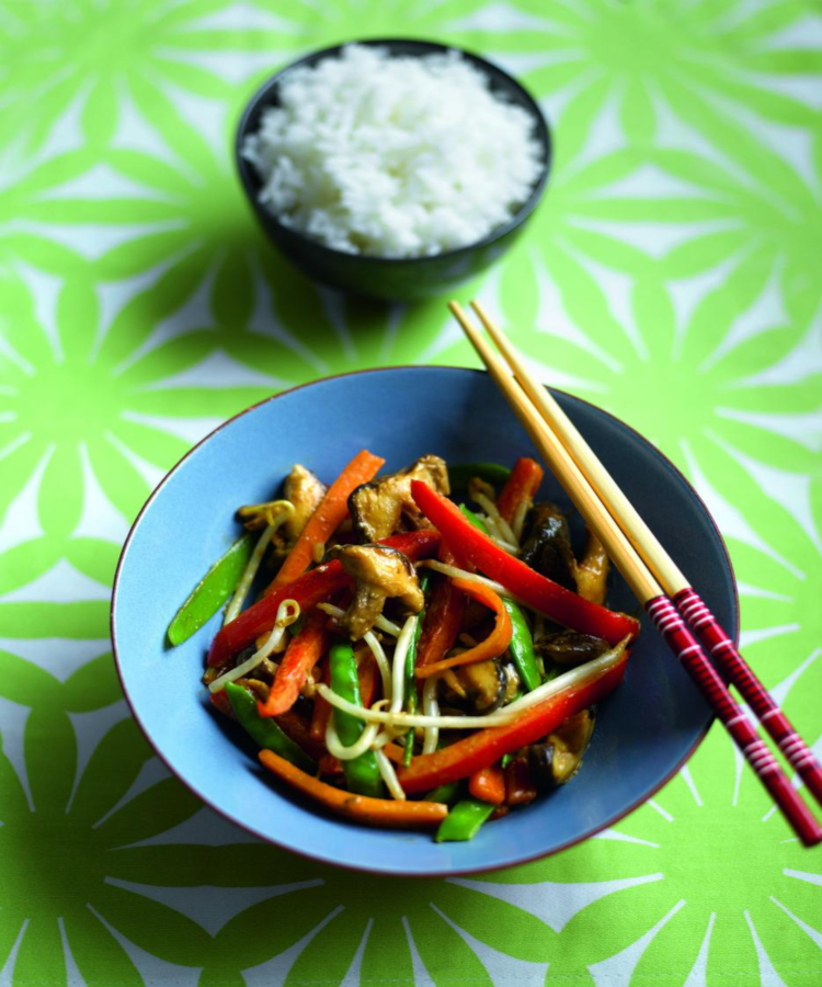 Then add the mushrooms and mange tout and stir-fry for 1 minute.